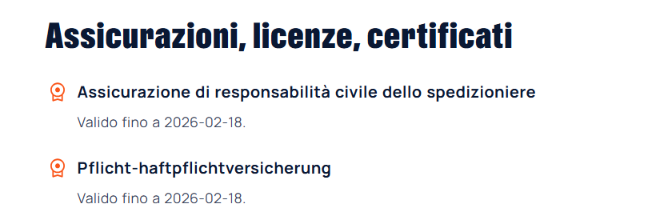 Il team Clicktrans verifica le polizze assicurative, le licenze e i certificati dei trasportatori. La verifica di questi documenti non è obbligatoria; tuttavia, tutte le imprese i cui documenti hanno superato la verifica ottengono le seguenti icone: